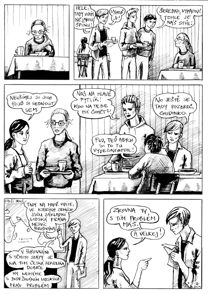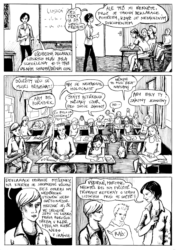 Série devíti komiksů na různá lidskoprávní témata. Tento komiks je ze školního prostředí, o Všeobecné deklaraci lidských práv a šikaně.